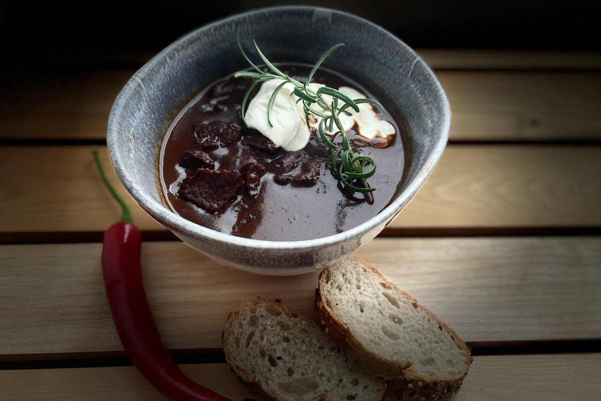 - Das Gulasch mit Salz und Pfeffer abschmecken. Zum Servieren Schmand und Baguette reichen.