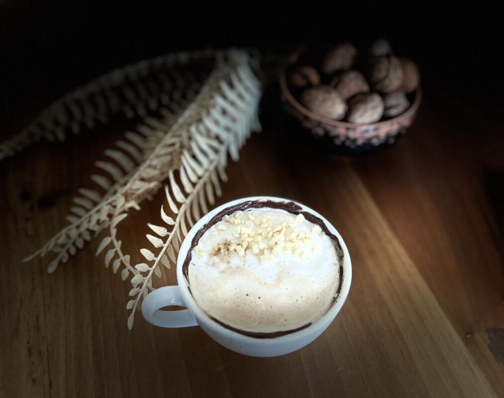 In dieser Variante haben wir die Tasse vorab mit Haselnusscreme präpariert und gehackte Mandeln als Topping eingesetzt.