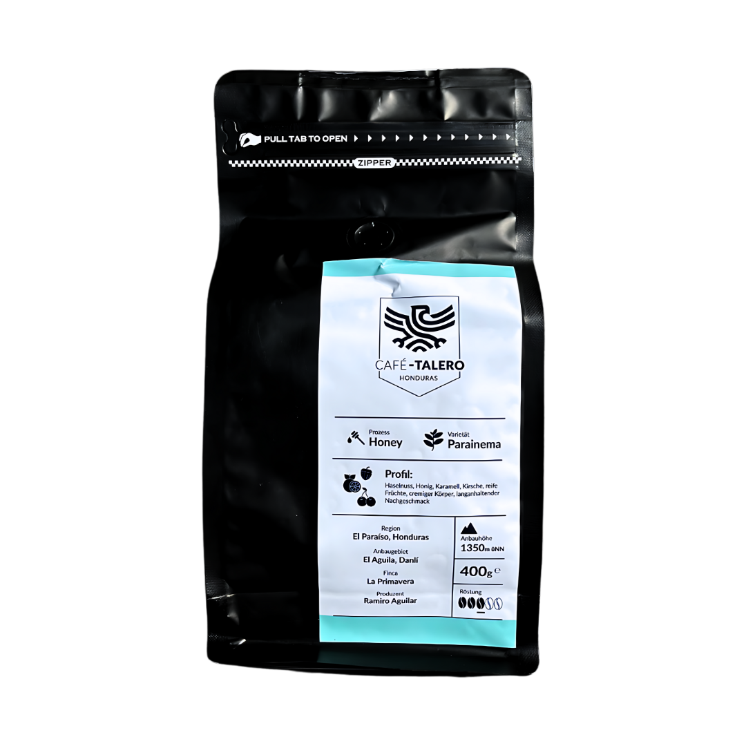 Café Talero ist ein limitierter Kaffee, der aus direktem Handel mit dem Kleinproduzenten Ramiro Aguilar aus der Region El Paraíso, Honduras stammt. Auf der Finca Primavera in 1350 m üNN wurde der Kaffee angebaut, geerntet und im Honey-Verfahren getrocknet, was dem Kaffee seine natürliche Süße verleiht und die durch Aromen von Haselnuss, Kirsche und Karamell abgerundet wird. Mit seinem vollen Körper und langanhaltenden Nachgeschmack ist dieser Kaffee der Varietät Parainema ein echtes Geschmackserlebnis. Der Kaffee wurde im Ursprung geröstet, was die volle Wertschöpfung vor Ort ermöglicht.
